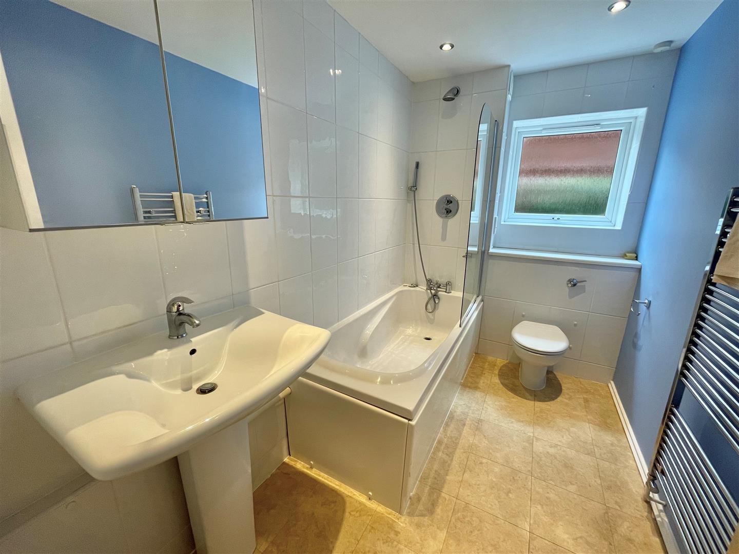 The family bathroom comprises a panel-enclosed bath with shower attachment, a vanity wash basin, concealed cistern WC, and a chrome heated towel rail.