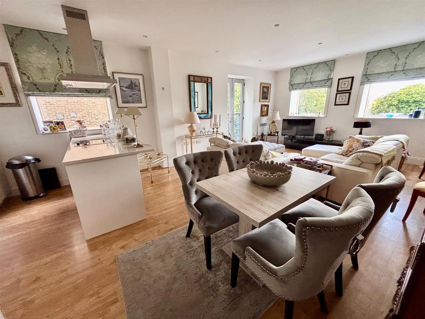 Occupying the third and fourth floors of a converted mill, the apartment is accessed via a communal entrance with lift or stairs. The heart of the home is a generous 26′ open-plan kitchen, dining, and sitting room, featuring French doors to a Juliet balcony overlooking the Grand Union Canal. The sleek, contemporary kitchen includes a breakfast bar and integrated appliances: oven, hob, microwave, washing machine, and dishwasher.