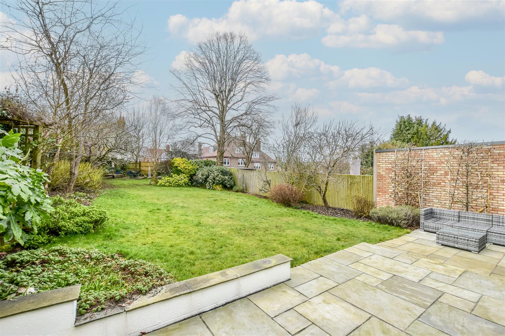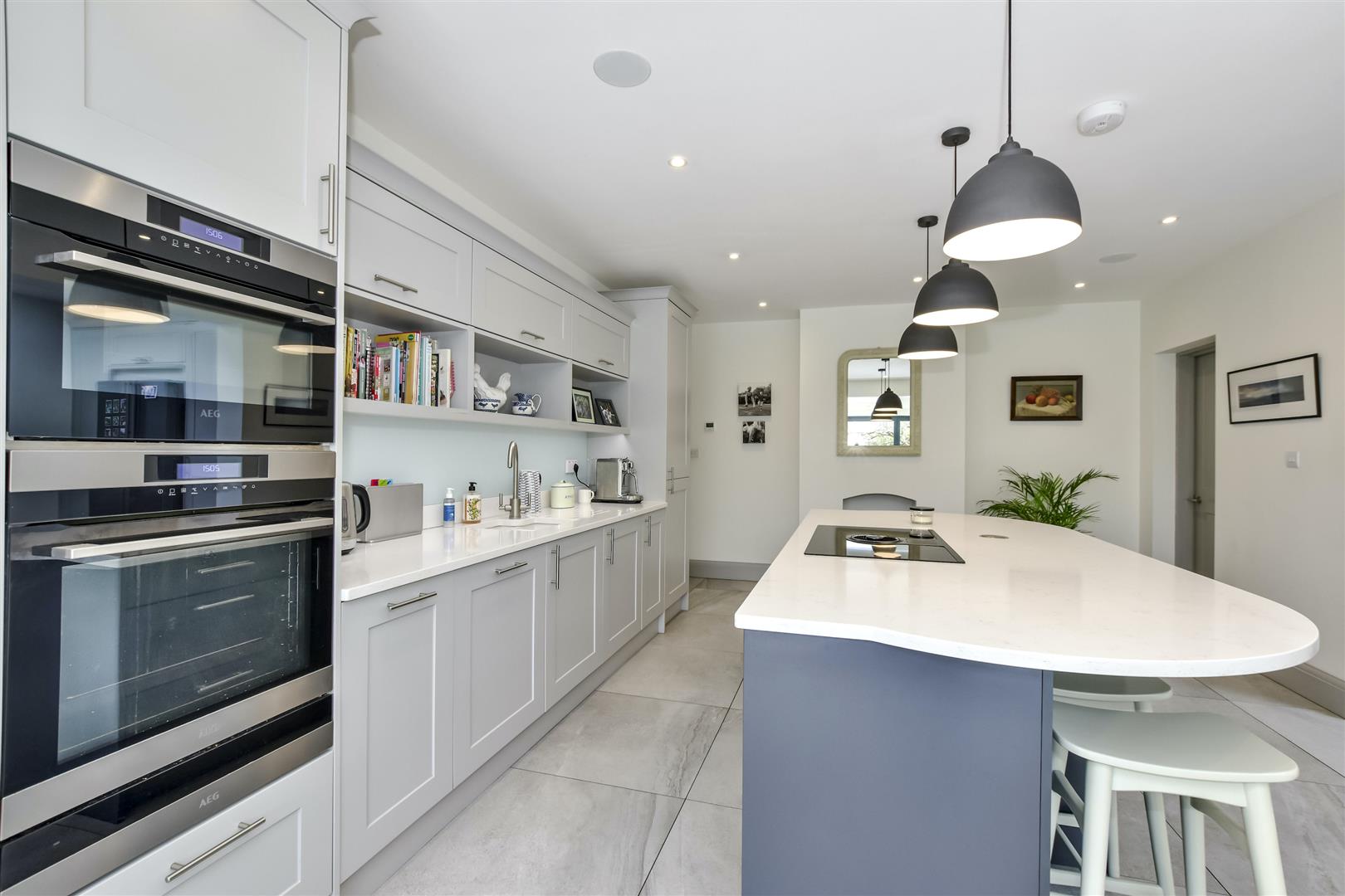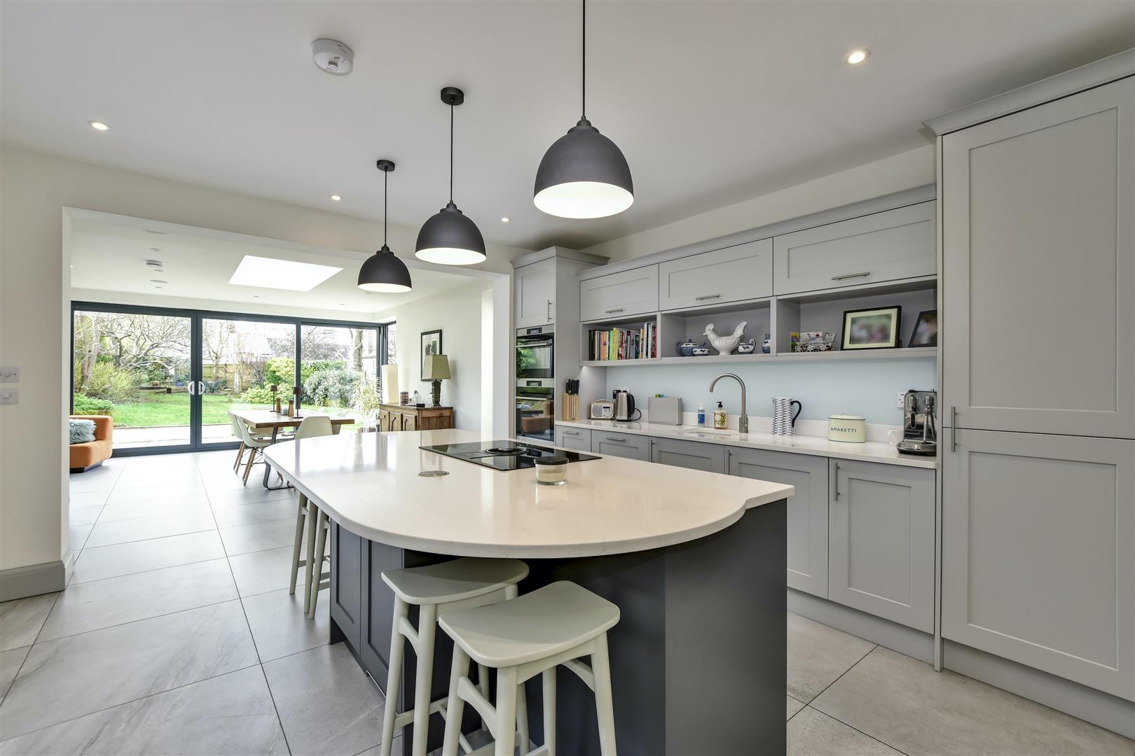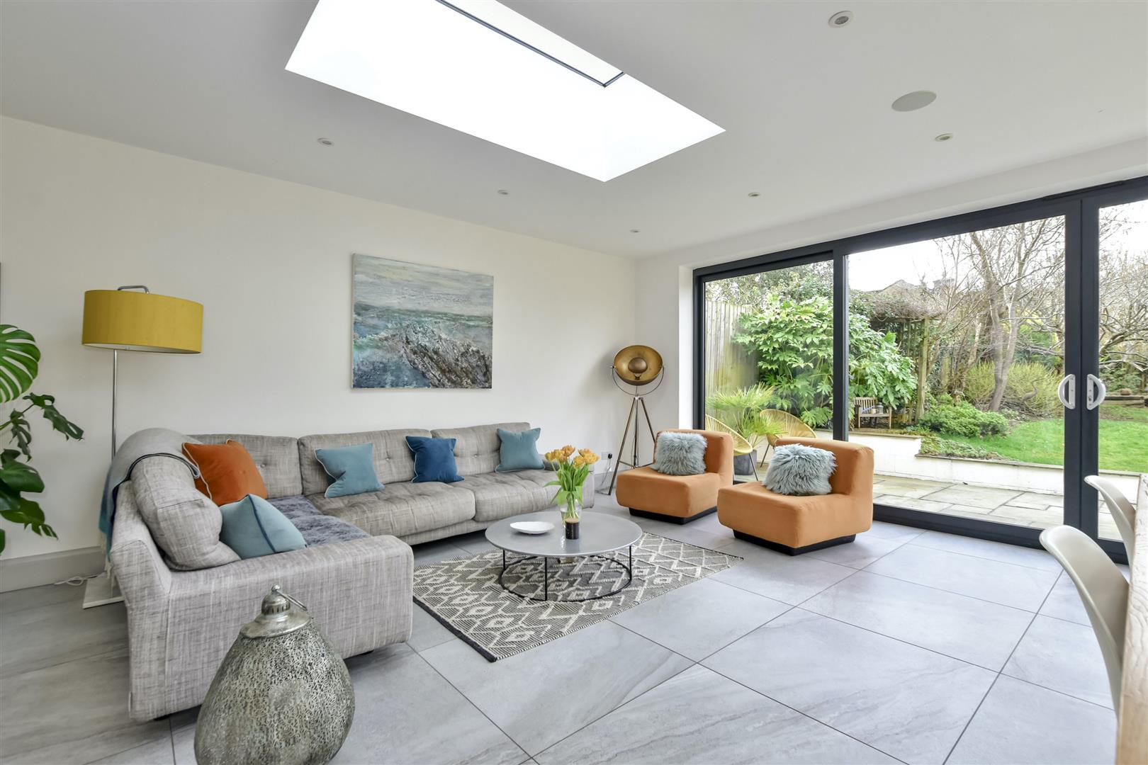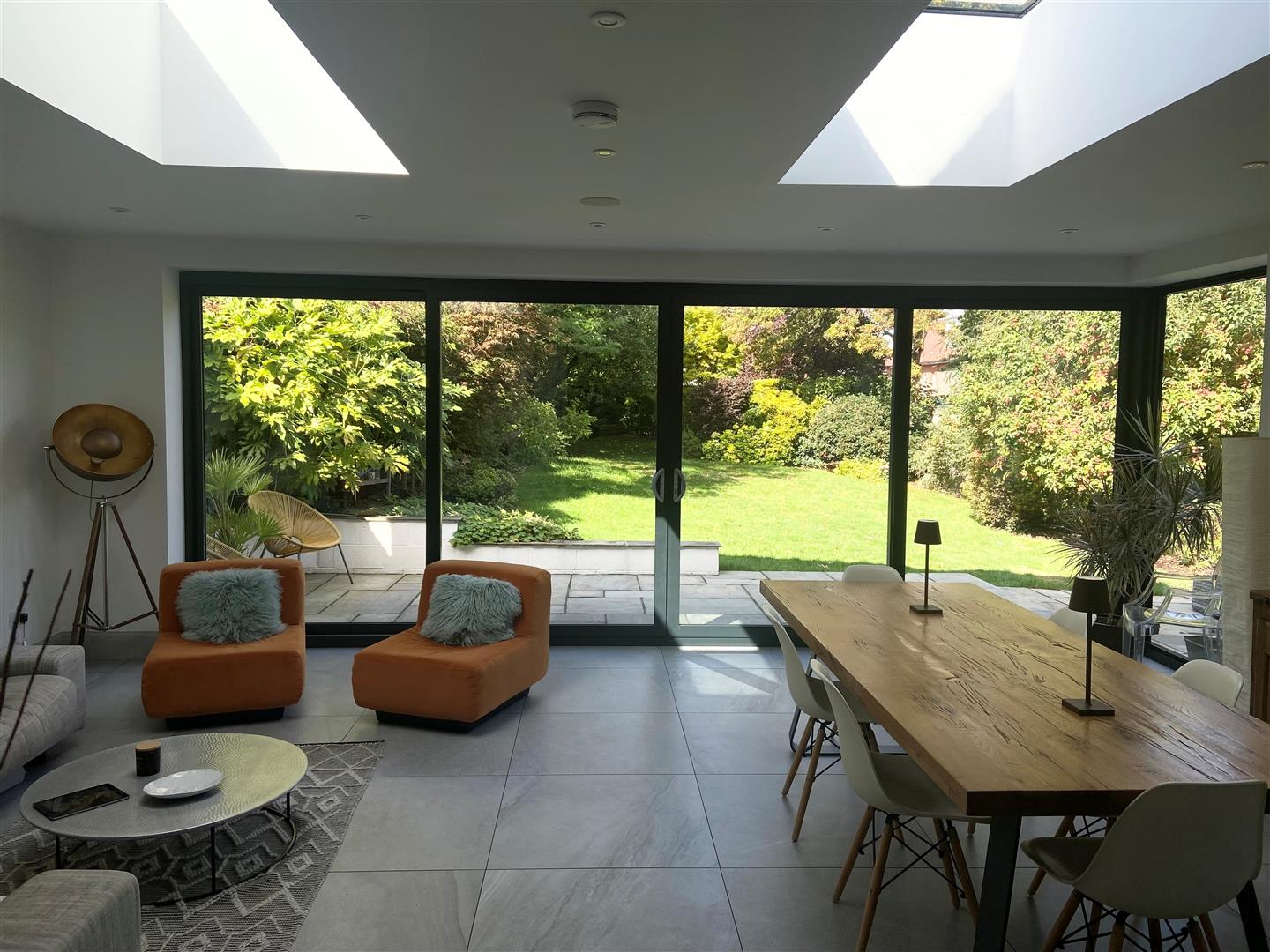 At the heart of the home is a truly spectacular open-plan kitchen, dining and entertaining area with floor-to-ceiling sliding doors opening onto a beautifully landscaped west-facing garden, offering exceptional privacy and tranquillity, a perfect setting for relaxation or outdoor dining.